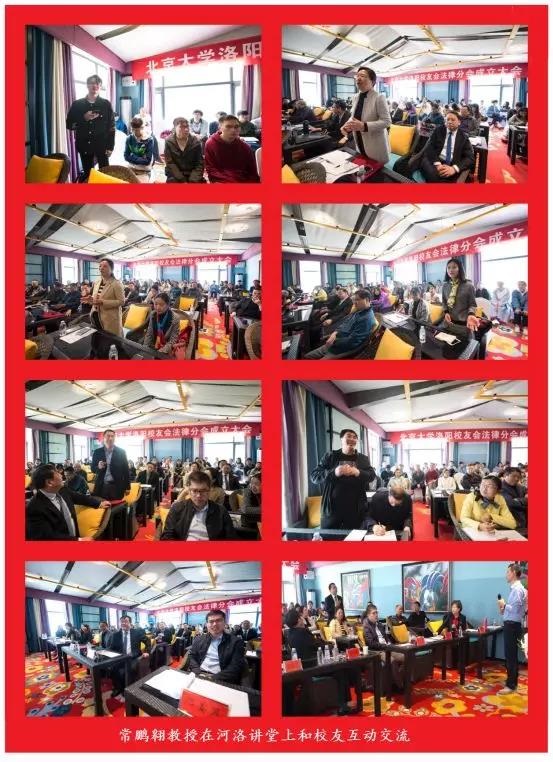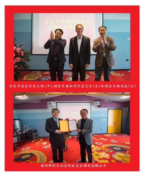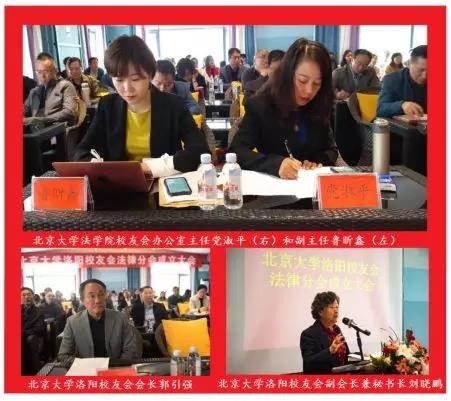 北京大学洛阳校友会常务理事赵大伟介绍法律分会筹备情况,会长郭引强宣读北京大学洛阳校友会拟提议法律分会导机构人选,与会校友代表举手表决,选举赵大伟任法律分会会长,袁志生任法律分会副会长兼秘书长,杨迅波任法律分会副会长。会上,北京大学法学院党委副书记、校友会副会长路姜男致辞,从凝聚校友、服务校友、助力校友三个方面介绍法学院校友工作情况及取得的成绩。北京大学法学院院长、法学院校友会会长潘剑锋发表讲话,从北京大学师生规模及构成、教学、科研、际交流、硬件设施等方面介绍了法学院近年来的主要工作和取得的喜人成绩,与会校友备受鼓舞,十分振奋。潘剑锋院长还向洛阳校友会颁发了赠送母校300株牡丹花的捐赠证书。