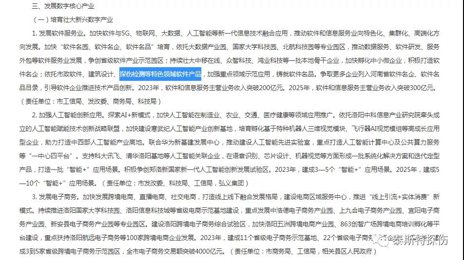 在《洛阳市数字化转型行动计划》中的第三项内容发展数字核心产业,其中的发展软件服务业讲到加快新一代信息技术融合应用,推动软件和信息服务业向特色化、集群化、高端化方向发展。加快“软件名园、软件名企、软件名品”培育,依托专业园区,推动数据服务、软件研发、服务外包等软件服务业发展,争创省级软件产业示范园区;持续壮大本地骨干企业,加快孵化中小微企业,积极打造软件名企;依托市政软件、建筑设计、探伤检测等特色领域软件产品,加强重点领域示范应用,铸就软件名品。争取更多企业列入河南省软件名企、软件名品目录,引导软件企业推进技术产品创新。