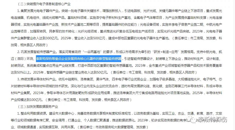 根据落实河南省政府“一谷两基地”的要求,形成以市场需求为牵引的“研发+制造+应用”发展格局。支持泰斯特探伤等企业发展具有核心元器件的新型智能传感器,引进智能传感器设计、封装等上下游企业,推动材料生产、设计制造、封装测试、系统集成和重点应用全产业链发展,打造中西部地区重要的智能传感器基地。
