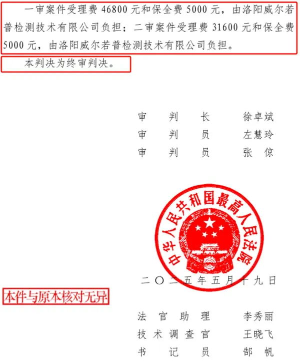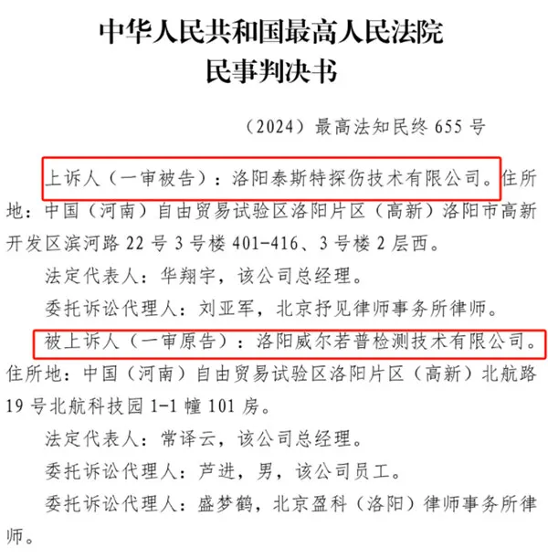 2023年,洛阳威尔若普检测技术有限公司恶意将我司告上法庭,诬陷我司制造、销售侵害其发明专利的产品。一审法院不顾事实,枉法裁判,导致我司败诉。同时未生效的一审判决迅速被威尔若普用作市场不正当竞争的武器,在行业内广泛散布我司“侵权败诉”的消息,同时向我司的客户发送法院判决书,宣传购买我司产品存在“法律风险”。导致客户被误导,对市场销售及回款造成致命打击。三年诉讼期间,泰斯特付出了沉重代价。超过30%的潜在客户流失,多个在谈项目被迫中止,直接经济损失五千多万元,商誉及间接损失不可估量。随着终审胜诉的落定,笼罩在泰斯特头上的阴霾终于散去。我们由衷的感谢最高人民法院知识产权法庭的公正判决,感谢所有在困境中给予我们信任与支持的客户、合作伙伴及各界朋友。泰斯特将以此胜诉为新的起点,轻装上阵,继续秉持务实创新精神,专注于无损检测技术的研发与应用,以更优质的产品和更完善的服务回馈市场,为行业的健康发展贡献泰斯特力量!